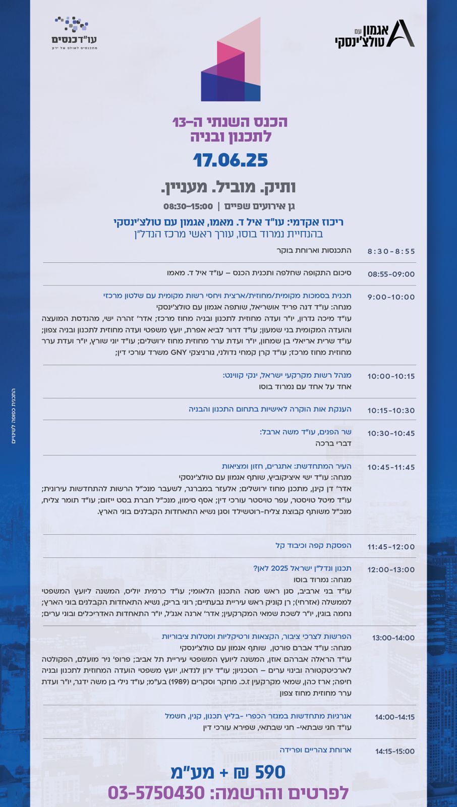 הכנס השנתי ה-13 לתכנון ובניה, שנדחה עקב המצב הביטחוני, יתקיים במועד החדש: יום שלישי 11.11.25 ב"גן בשפיים".
