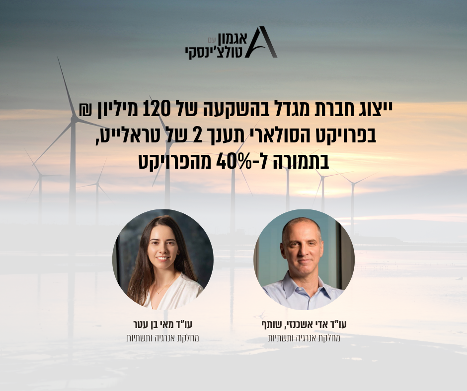 אגמון > פרסומים ועדכונים > ייצוג חברת מגדל בהשקעה של 120 מיליון ₪ בפרויקט הסולארי תענך 2 של טראלייט, בתמורה ל-40% מהפרויקט