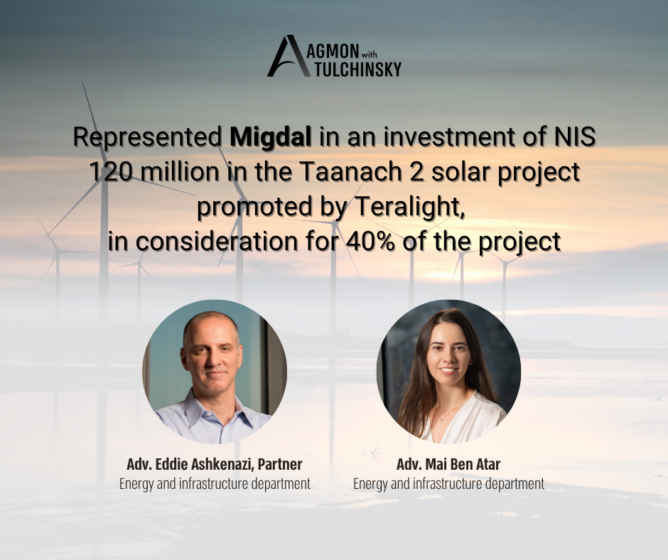 Eddie Ashkenazi and Mai Ben Atar from our firm’s Energy Practice represented Migdal in a significant investment of NIS 120 million in the Taanach 2 solar project promoted by Teralight, in consideration for 40% of the project. The Taanach 2 project consists of a 107 MW PV facility with up to 440 MW/h of storage.